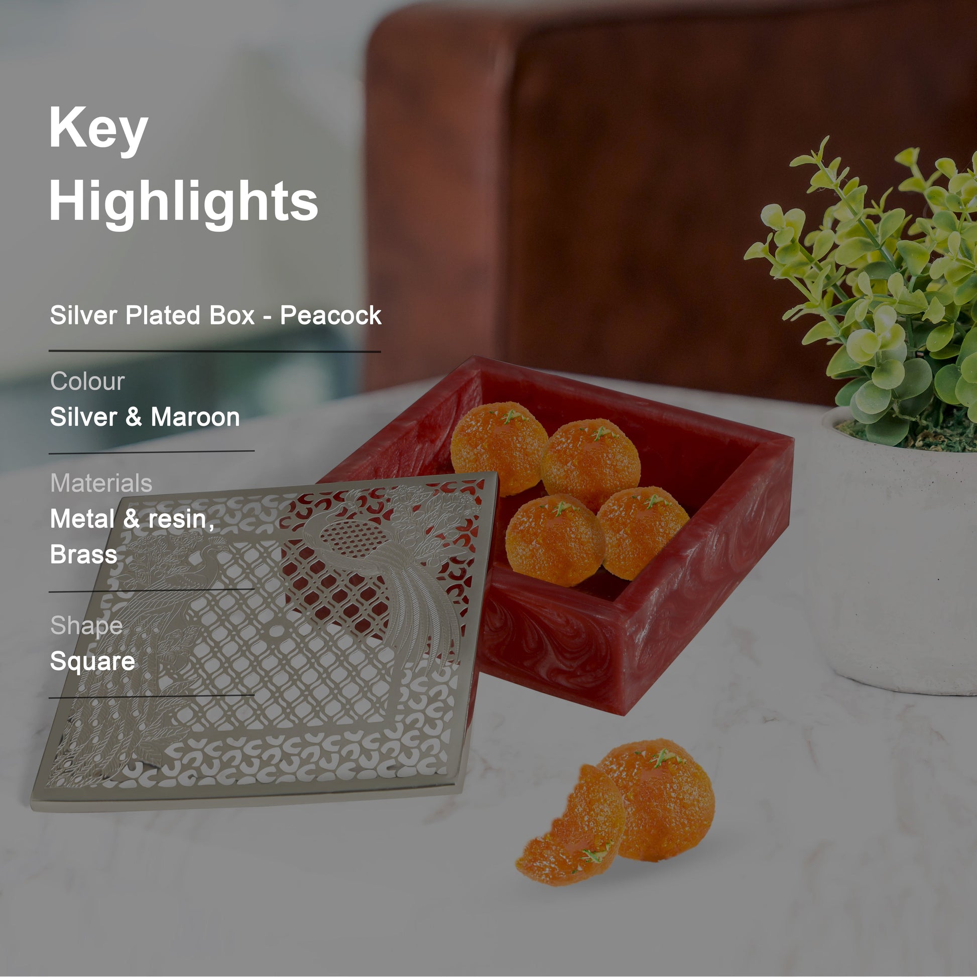 Resin Box With Brass Silver Plated Peacock Design Cut Lid